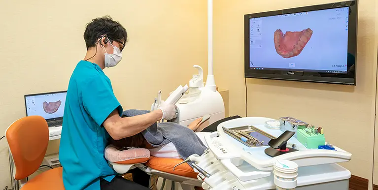 先端の医療機器を導入し、インプラントを安全に埋め込むためのCTスキャニング、CAD/CAMセンターにはコンピューターで画像を取り入れ、それぞれ3次元的に解析して義歯を作っていく技工室があります。かみ合わせの調節などもすべて院内で完結するため、精度の高い迅速な治療が可能です。